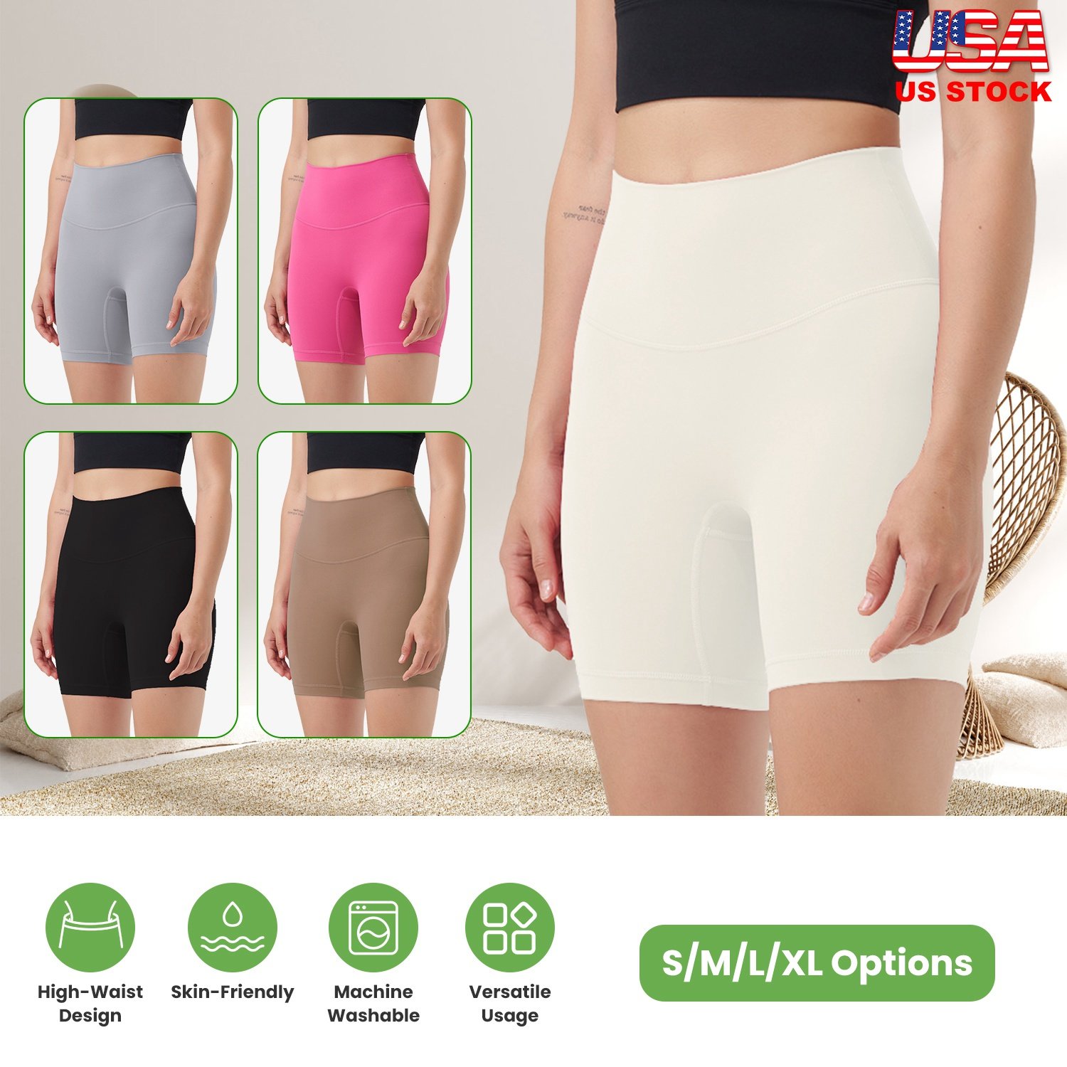 Our high-waist biker shorts made from 80% Polyamide and 20% Elastane, give you freedom of movement no matter what you’re doing and provide you with the most comfortable feelings and elegance all the time. The widened high waisted band is great to provide sturdy support to help your tummy control and cover navel. A straight seam on the buttock is great to contour your curves. And no front seam design ensures smooth lines and added comfort. Super soft, skin-friendly, stretchable and moisture-wicking, ensuring ease of movement. Optimal for cycling, workouts, yoga, and everyday fashion. Pink, Grey, Coffee, Ivory, Black is available to choose as you need.