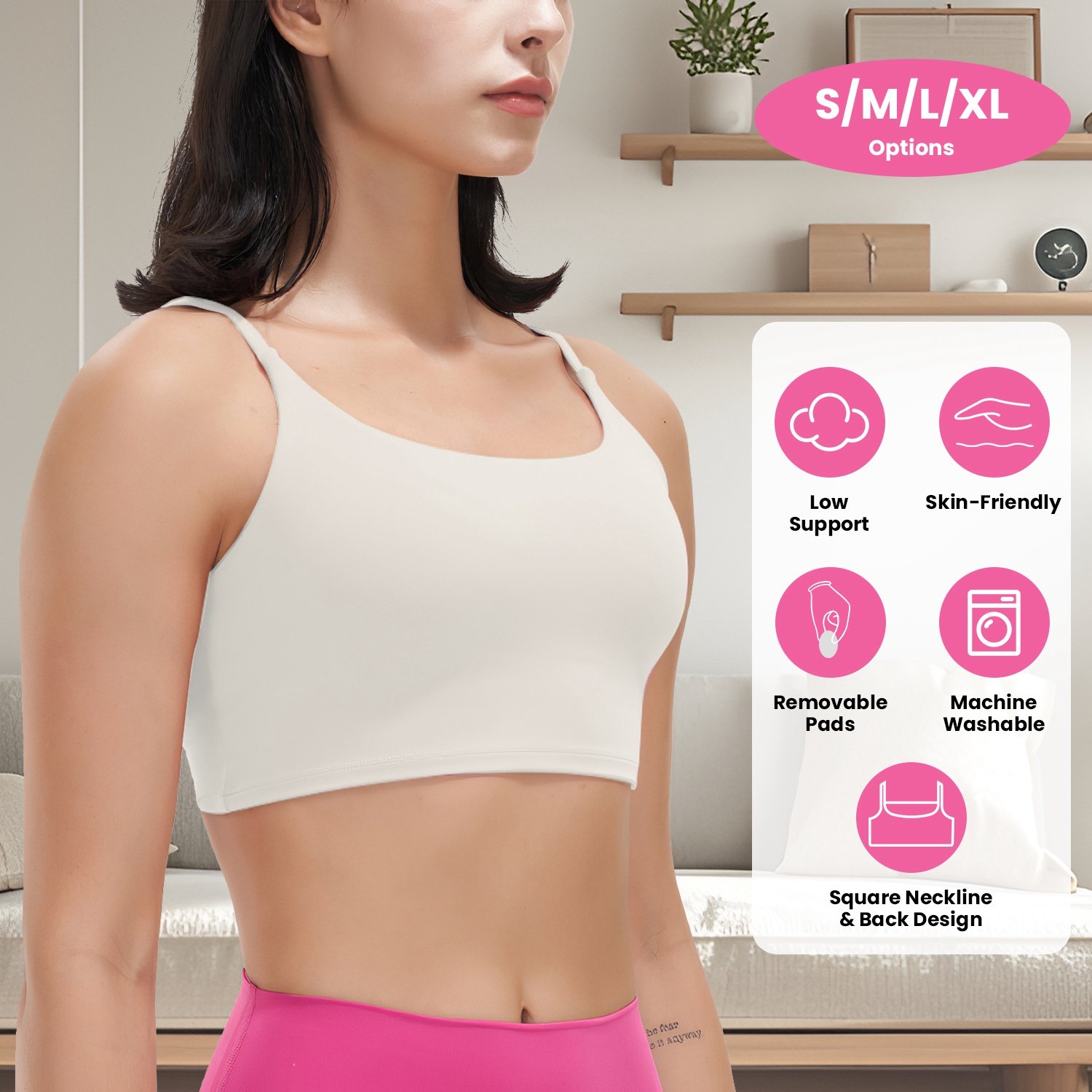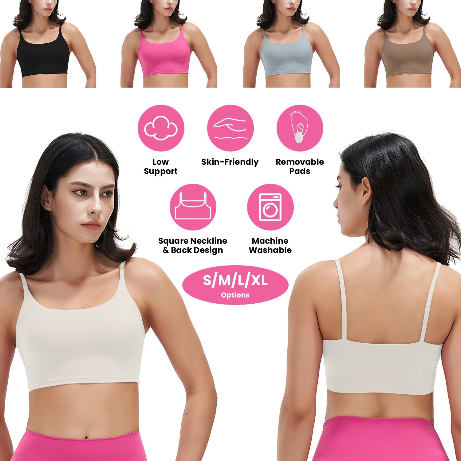 Do you like exercising? Our Sports Bra is super soft, moisture-wicking and breathable to keep you cool and comfortable every moment during work-out! Flat elastic shoulder straps and square neckline and back design give you low support to hold your breasts in place and show your sexy back line perfectly! Ideal for everyday sports like gym exercise, yoga, running, etc. as well as great for wearing under workout shirts like tank tops and light clothing!